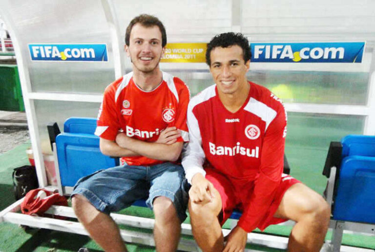 O universitário Pedro Augusto Thomas, 19 anos, morador do bairro São José, graduando em Ciências Biológicas pela Universidade Federal de Santa Maria (UFSM), embarcou para Colômbia em 10 de janeiro para um intercâmbio de seis semanas. “Sabíamos que o Inter viria jogar em Manizales, então tentamos ir ao estádio. Achávamos que não conseguiríamos. Entretanto, fomos autorizados a entrar mostrando apenas um do-cumento que comprovava nossa nacionalidade. Foi fácil. Estar lá no treino ao lado dos jogadores para tirar fotos e vivenciar o momento foi incrível”, relata o estudante. “Quanto à ideia da faixa durante o jogo, queria que quem me visse pela televisão soubesse que era eu, tanto meus amigos de Arroio do Meio, como os de Santa Maria, e bem como divulgar o nome da minha cidade” revela.