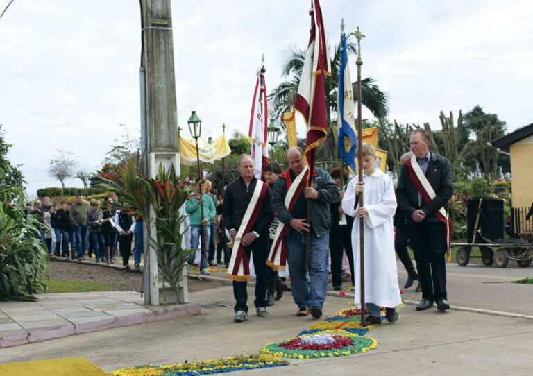 Arroio do Meio – O frio não impediu os fiéis de levantarem cedo, ontem, para confeccionarem os tradicionais tapetes de Corpus Christi na comunidade católica de Forqueta. As atividades começaram às 6h, reunindo cerca de 40 voluntários que realizaram um belo trabalho usando serragem colorida, farinha, areia, borra de café, pétalas de flores e pequenos acessórios.