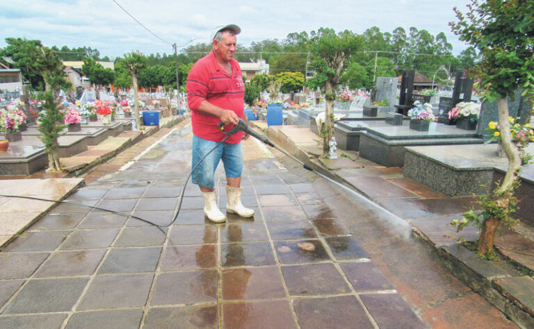 O serviço de lavagem, varredura, recolhimento de lixo, realizado pelo funcionário da paróquia, Ilton Schmitz, foi intensificado há cerca de três semanas e concluído nessa semana. “O trabalho que é realizado durante todo o ano se intensifica nessa época, inclusive depois do feriado dos Finados, com o recolhimento de lixo e flores que são trocadas por novas pelos familiares”, explica.