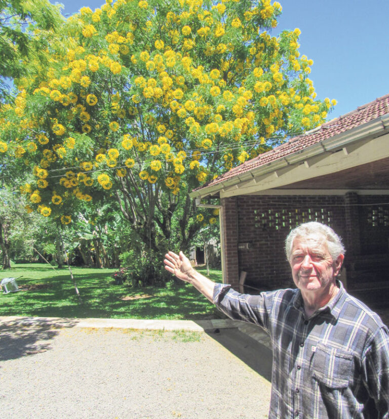 O bolão de ouro que possui em seu pátio hoje, foi plantado no início da década de 1990, logo após concluir a construção de sua residência, quando começou a se dedicar ao paisagismo. A árvore foi podada apenas uma vez e possui 15 metros de altura e copa de um diâmetro de 20 metros. “Se não me engano, quem trouxe a semente foi o Altemir Gerhardt de Linha Marinheira. Hoje ele é representante comercial da Girando Sol. Na época os alunos chamavam a árvore de facão, pois a sementes vinham numa vagem de em torno de 45 cm, que se desenvolve após a floração. Apesar das vagens, aqui nenhuma semente virou muda, pois o clima não é propício”, recorda.