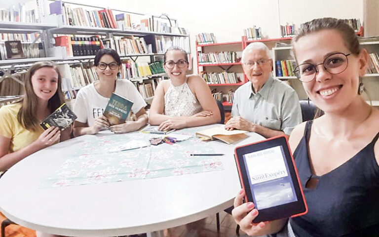 O livro que é lido e debatido atualmente pelo grupo é Terra dos Homens, de Antoine de Saint-Exupéry.