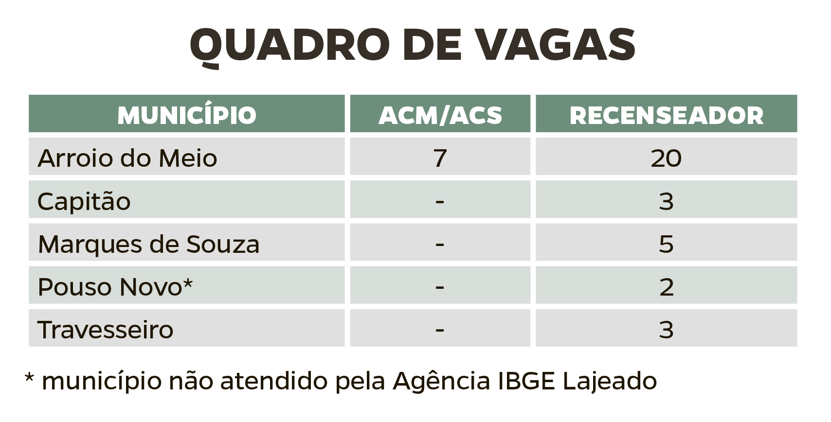 Na região de Lajeado, que abrange 24 municípios, são 400 vagas temporárias para os cargos de agente censitário municipal (ACM), agente censitário supervisor (ACS) e recenseador. A subárea de Arroio do Meio compreende mais seis municípios – Santa Clara do Sul, Forquetinha, Canudos do Vale, Sério, Marques de Souza e Progresso – e dispõe de 45 vagas para recenseador e sete para ACM/ACS. As inscrições são feitas exclusivamente na internet, no site do IBGE ou https://www.cebraspe.org.br/concursos/IBGE_20_AGENTE