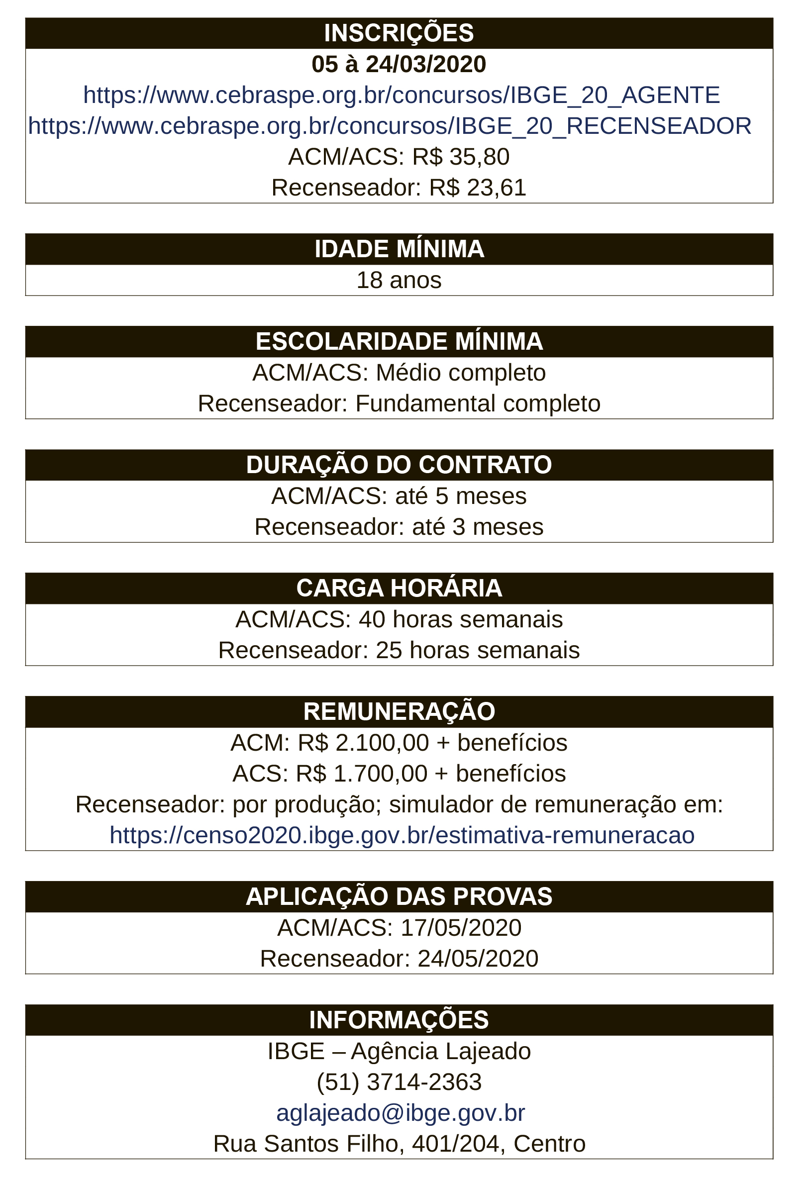 • https://www.cebraspe.org.br/concursos/IBGE_20_RECENSEADOR. A prova objetiva será realizada nos municípios sede de Postos de Coleta, o que inclui Arroio do Meio. Como as provas são em dias diferentes, é possível fazer a inscrição para as duas funções.
