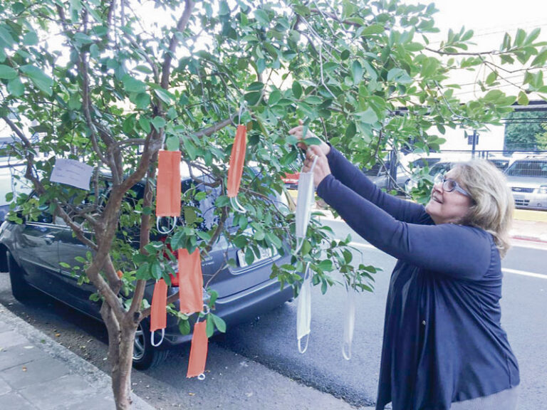 Em Arroio do Meio, na rua Gustavo Wienandts, uma simples árvore virou um símbolo de empatia pelo próximo. A ideia surgiu quando Marli Gasparoto Nos recebeu uma doação de material de TNT. Ela fez máscaras e colocou na árvore na frente da sua casa, com um bilhete dizendo que elas estão à disposição para quem quiser pegar.