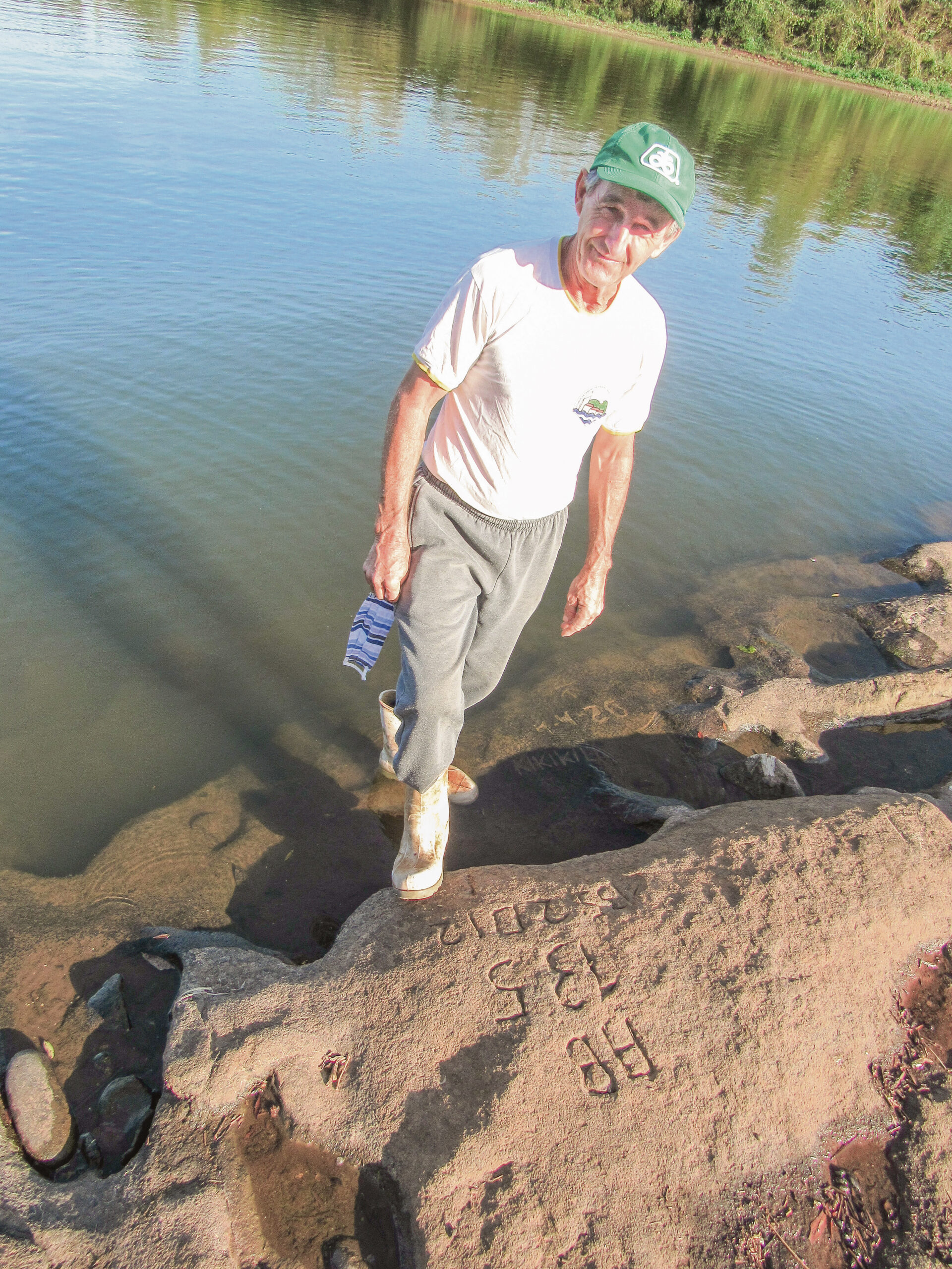 A reportagem do AT teve acesso ao local, de barco, acompanhando o produtor de grãos, bovinocultor e pescador, João Delmar Schmitz, 62 anos, morador do Passo do Corvo. Pelo fato de o leito estar baixo, a navegação até a laje só é possível com conhecedores, devido ao risco de encalhamentos.