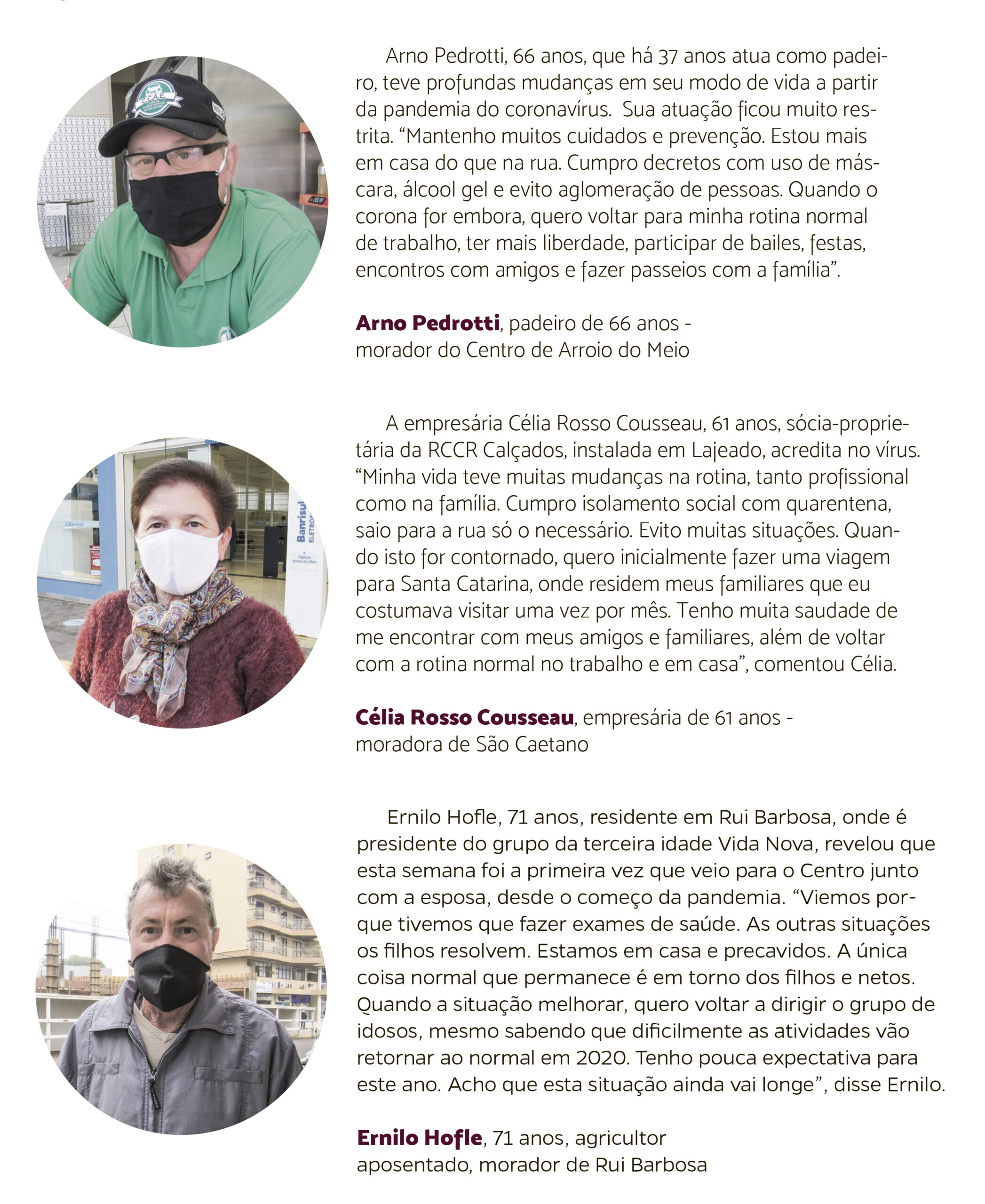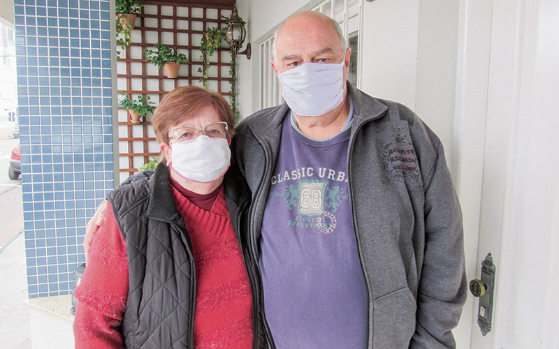 O casal Delmar Franzen, mais conhecido por Soneca, 77 anos e 28 anos aposentado como funcionário do Curtume Aimoré e sua esposa Isolde, 74 anos, também aposentada, que reside em apartamento no Centro de Arroio do Meio, vivem em quarentena desde o anúncio do coronavírus. As saídas são poucas. Até as idas para o mercado ficaram restritas, junto com caminhadas que o casal costumava fazer na área de lazer. Isolde disse que essa doença faz o casal ficar com medo. “Até mesmo a máscara dá uma sensação de medo na gente”, comentou Isolde. “A gente dorme, come, assiste TV inclusive muitas coisas de antigamente, notícias e alguns filmes, para passar o tempo”, disse Soneca. Isolde se dedica a leituras, jogos eletrônicos no computador, além de outros jogos de lazer, como paciência. “Com a chegada do inverno, os dias mais curtos ajudam a passar o tempo”, comentou Soneca.