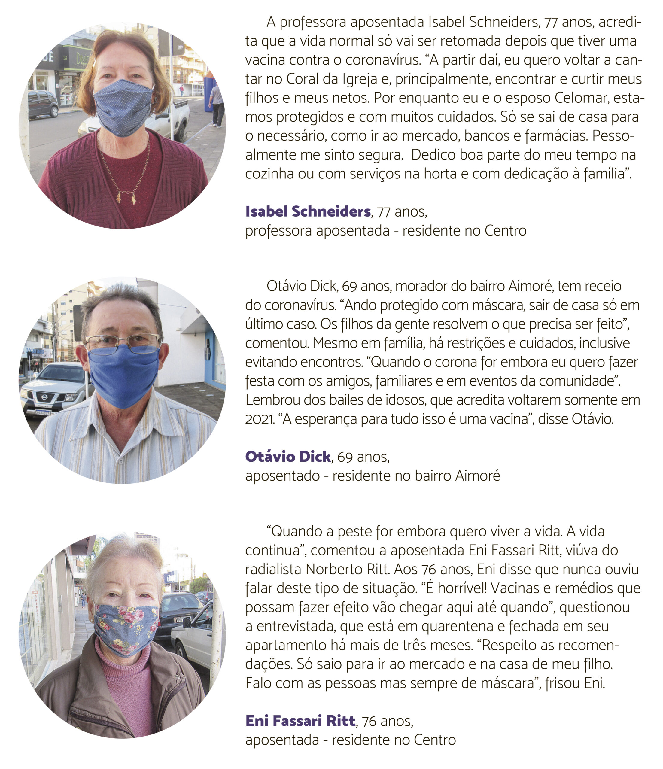 O casal Gilberto Nos, 66 anos, empresário aposentado e Marli Nos, 62 anos, professora do Estado aposentada, fazem passar o tempo de forma divertida. Quase que totalmente confinado por cerca de três meses, o casal faz passar o tempo com trabalho e atividades de lazer. Marli, dedicou grande parte deste tempo fazendo costura de máscaras e jalecos. Já Gilberto, tomou conta da casa fazendo pequenos reparos que aguardavam por uma oportunidade para serem atendidos e na arrumação e colocação de quadros nas paredes. Também foi para o jardim onde promoveu limpeza e plantio de mudas, exercendo o mesmo numa horta que a família possui. “Além disso, dei uma de dona de casa fazendo almoço, inclusive lavando e secando a louça”, disse em tom de brincadeira. Na parte da tarde o casal se ocupava junto com o nono e a nona com jogos de carteado. “Como eu gosto, busquei leituras de jornais diários e leituras eletrônicas, onde descobri muitas coisas. Pouco do tempo foi ocupado para assistir programas de TV. O casal saiu pouco e quando o fazia, sempre estava protegido. Em casa a vida segue com normalidade, havendo precauções durante encontros com os filhos que residem em outros endereços.