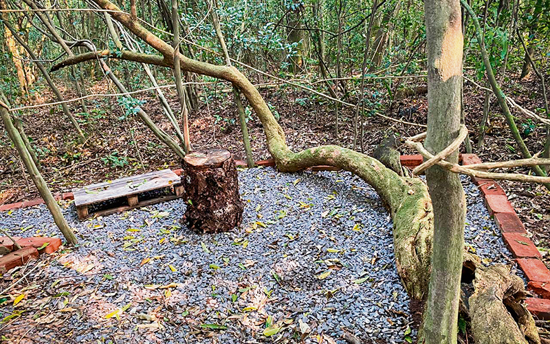 O projeto está sendo criado em conceito rústico e integrado com natureza através da utilização de materiais de demolição tanto em parte da construção, como nos decks, pergolados, bancos, mesas e lustres. Palets viraram bancos, recursos naturais como cipós, fazem demarcação do espaço e árvores caídas são utilizadas como banco e arco para criar um palco de cerimônias para casamento.