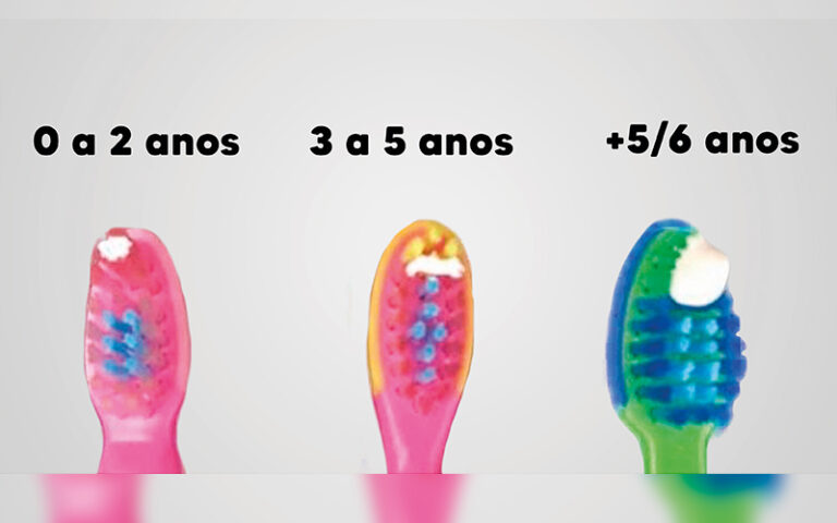 Quantidade de creme dental: As crianças têm dificuldade em cuspir, por isso precisamos ficar atentos na quantidade de creme dental colocado na escova de dentes. Veja na imagem acima as quantidades corretas.