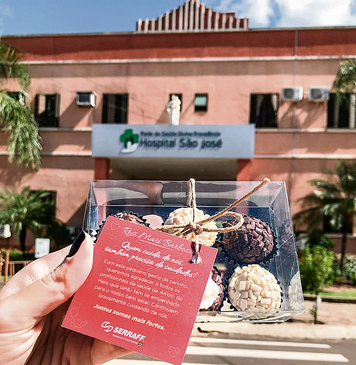 Assim, na quarta-feira que antecedeu a Páscoa, a Serraff, na pessoa do proprietário, João Carlos Scheibler, sua filha Vitória (estudante de medicina) e a profissional Bruna Heineck, deixou junto às gestoras do HSJ, Rosi Mari Barbosa – gerente assistencial – e Niura Rodrigues da Silva – gerente administrativa – mimos doces personalizados à toda a equipe do hospital. “Afinal, quem cuida de nós, também precisa de cuidados. Também precisa, como todo o cidadão, da renovação e da esperança em dias em que tudo isto que se vive e foi vivido, faça parte de uma passado de superação”, afirma João Carlos Scheibler.