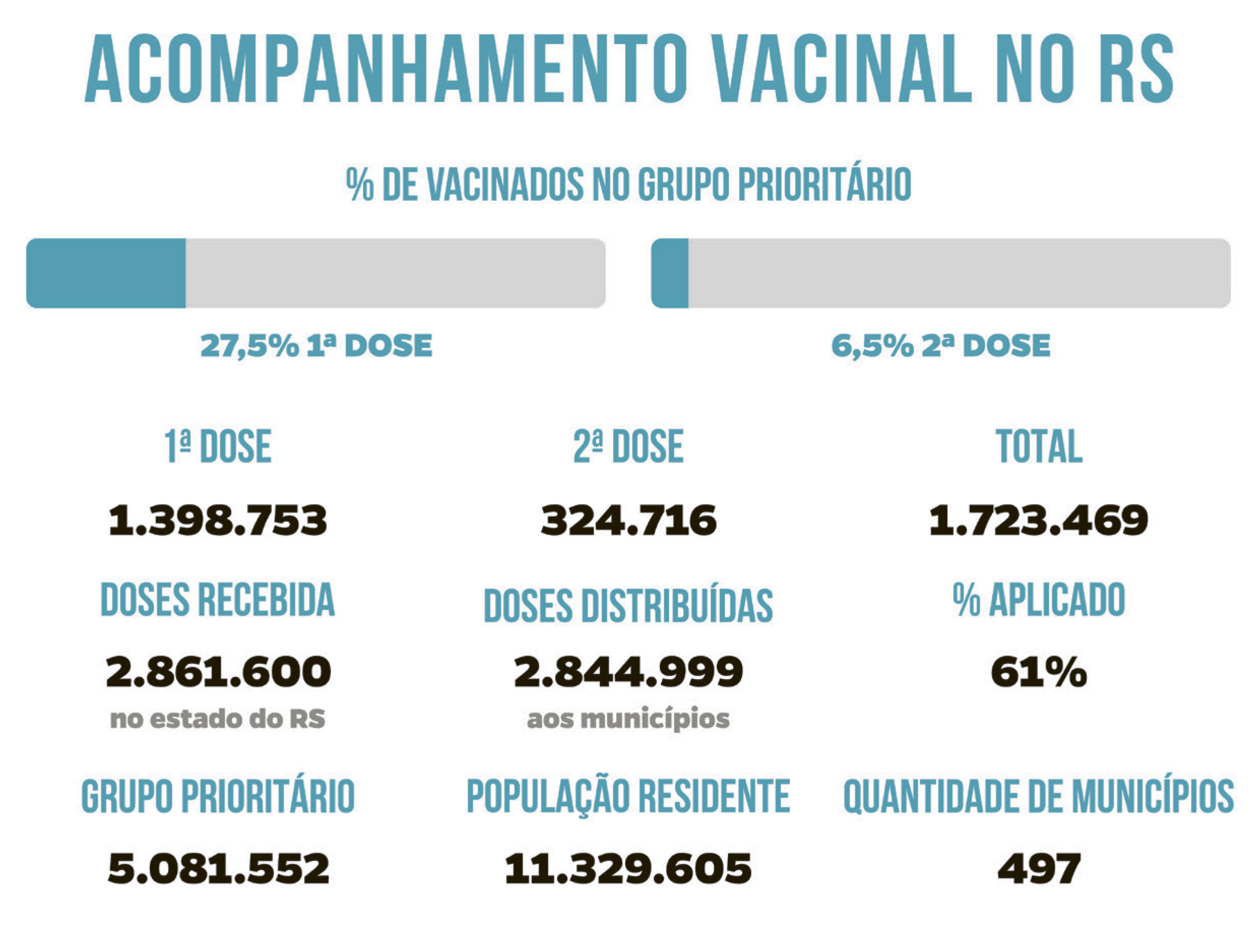 O Rio Grande do Sul recebeu no dia 1º deste mês, a maior remessa de vacinas contra a covid-19, repassada ao estado até o momento. Foram 600.400 doses de CoronaVac, do Instituto Butantan, e 44.750 da Oxford/AstraZeneca, produzida pela Fiocruz, totalizando 645.150 enviadas pelo Ministério da Saúde. O carregamento chegou a Porto Alegre, de manhã, em avião da empresa aérea Azul, que pousou no aeroporto Salgado Filho. O maior lote havia sido o primeiro, com 341,8 mil doses, em 18 de janeiro.