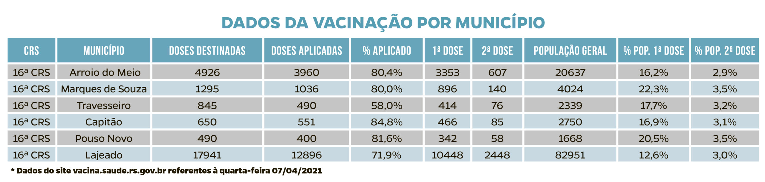 Na região que compõe a 16ª CRS, a qual Arroio do Meio, Capitão, Marques de Souza, Travesseiro e Pouso Novo fazem parte, no mesmo dia foi enviado, pela coordenadoria, um e-mail solicitando a retirada dos imunizantes. Conforme a técnica em enfermagem, Rodiane Barbosa, da Secretaria Municipal de Saúde de Arroio do Meio, todo o processo, desde a busca das doses, até a aplicação na população, obedece a um rigoroso quadro de critérios. Segundo ela, um técnico e um motorista levam até a coordenadoria uma caixa para armazenamento – tudo criteriosamente ambientado com temperatura entre dois e oito graus. “A nossa caixa tem de chegar lá, e não atrasar também o fluxo, pois são 56 regiões. Temos um determinado horário para retirar, o técnico confere as vacinas com o técnico da 16ª, conferem o lote, laboratório, a temperatura da caixa,” explica.