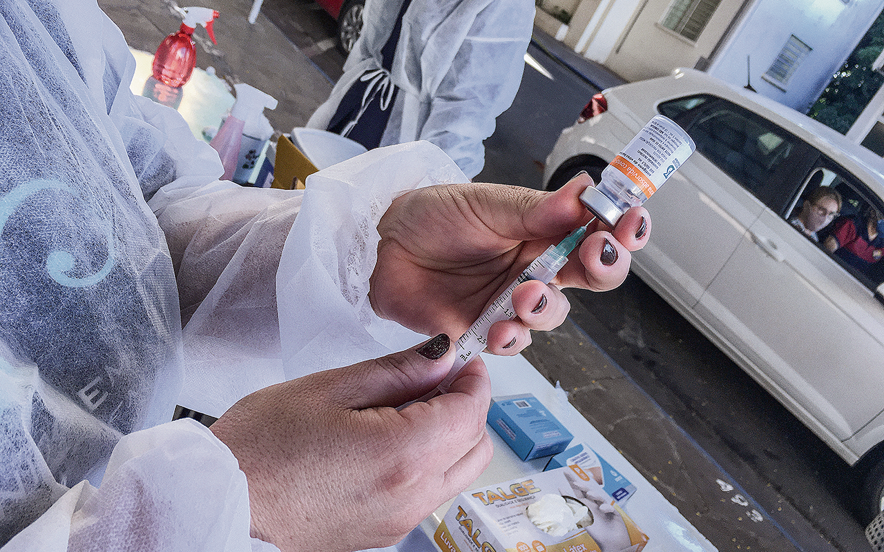 Para organizar o drive thru, a equipe de saúde já costuma deixar algumas seringas prontas para aplicação (com a dosagem da vacina já aspirada, feita pouco antes de ir para a Rua de Eventos), conferindo mais agilidade ao movimento da vacinação. A medida de vacina na seringa é de 0,5 ml a dose e todas elas vêm com a marcação mostrando a quantidade, que é rigorosamente conferida e cuidada sempre. O processo mantém toda a assepsia necessária e é controlado apenas por Rodiane e mais uma técnica, evitando que muitas mãos manuseiem o material. “Depois, nós duas ficamos responsáveis também por aspirar aqui (Rua de Eventos), ficamos controlando, conforme vai terminando o estoque, vamos repondo”, observou a técnica, que na manhã de terça-feira atuava na vacinação.