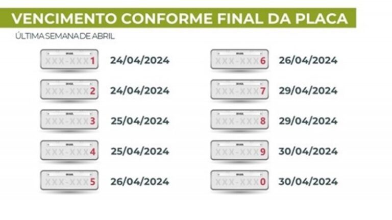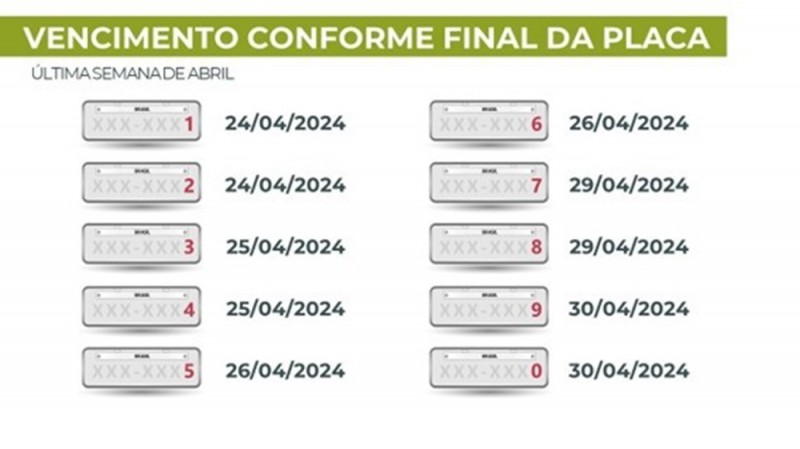 O calendário de vencimentos seguindo o cronograma por numeração final da placa do automóvel inicia em 24 de abril, dia em que termina o prazo para quitação de veículos com final 1 e 2. O vencimento para outros números finais de placa ocorre nos últimos cincos dias úteis do mês até quarta-feira (30/4), data em que vencem as placas com final 9 e 0.