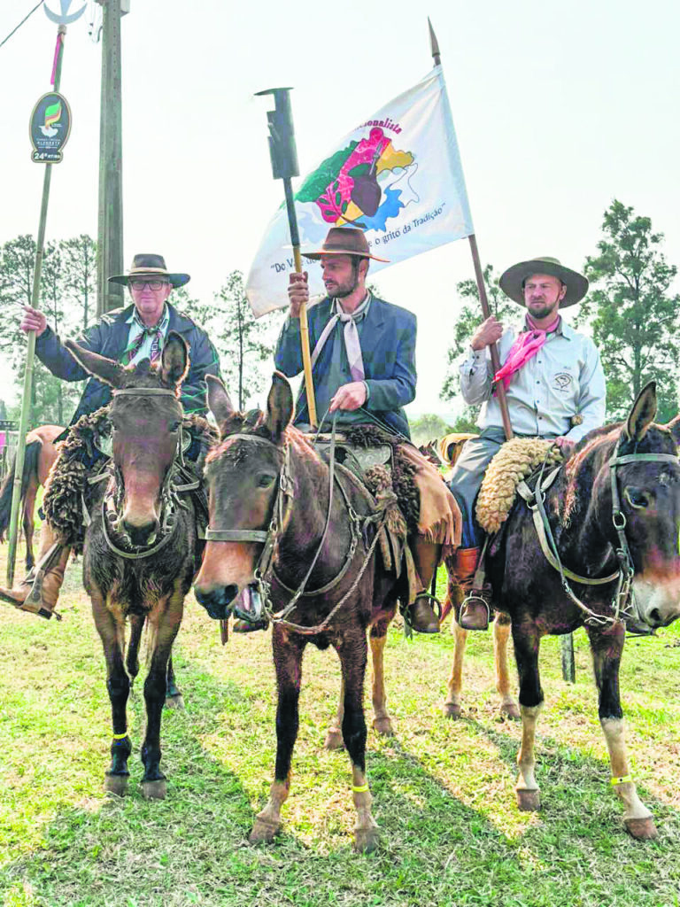 Os cavaleiros Davi Musskopf, Paulo Feil e Matheus Zanatta (Zico), do CTG Caminhos da Serra, de Marques de Souza e CTG Travessia Crioula, de Travesseiro, que representaram a 24ª Região Tradicionalista, na solenidade de acendimento da Chama Crioula realizada no sábado, dia 17, pelo Movimento Tradicionalista Gaúcho – MTG na cidade de Alegrete, devem chegar a Marques de Souza na manhã deste sábado, dia 31, depois de fazer o caminho de retorno de mais de 530 quilômetros no lombo de burros carregando a centelha da Chama Crioula.