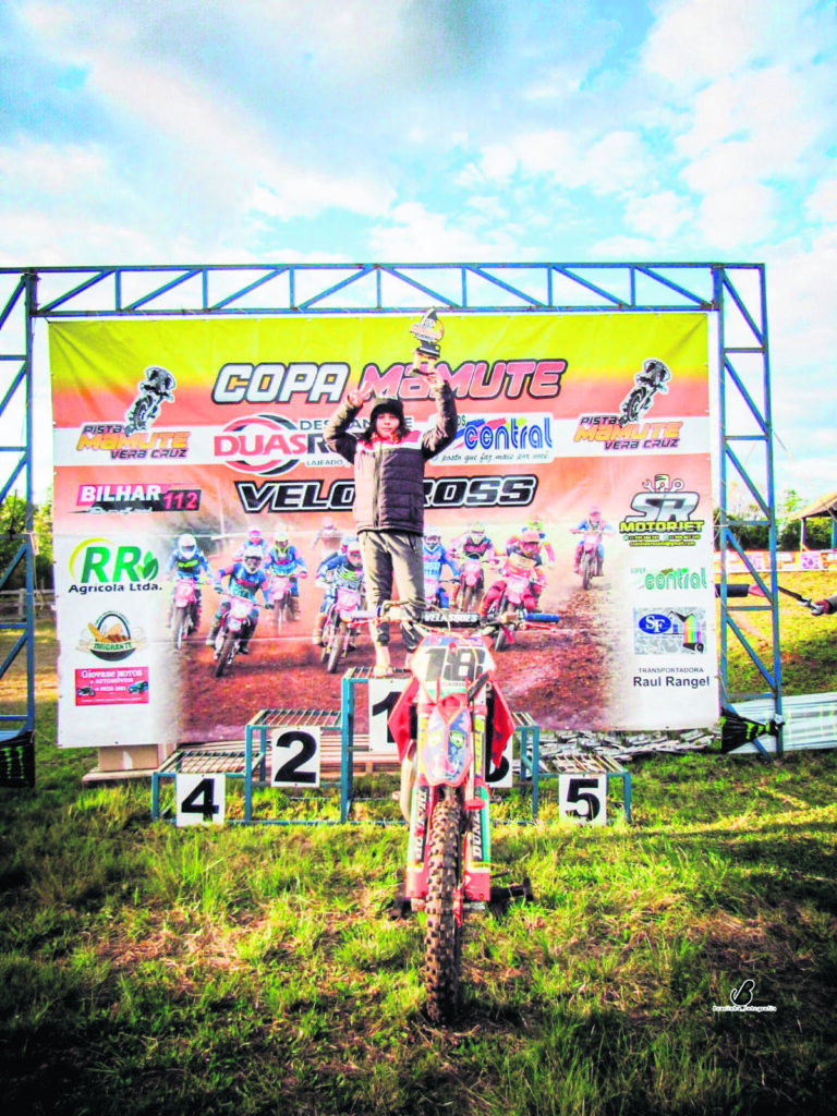 Velasques, o ‘Rinoceronte Voador’, tem 12 anos e vem se destacando no velocross. O jovem pilota uma moto KTM 85 cilindradas e na categoria que foi vencedor competiu com pilotos adultos com motos de 450cc. “Pela idade, ele deveria estar competindo na categoria de 65cc, mas pelo seu tamanho e pela técnica ele compete na categoria Junior – até 15 anos e na VX1”, relata o pai Cristiano Velasques. A família mora no distrito de Forqueta.