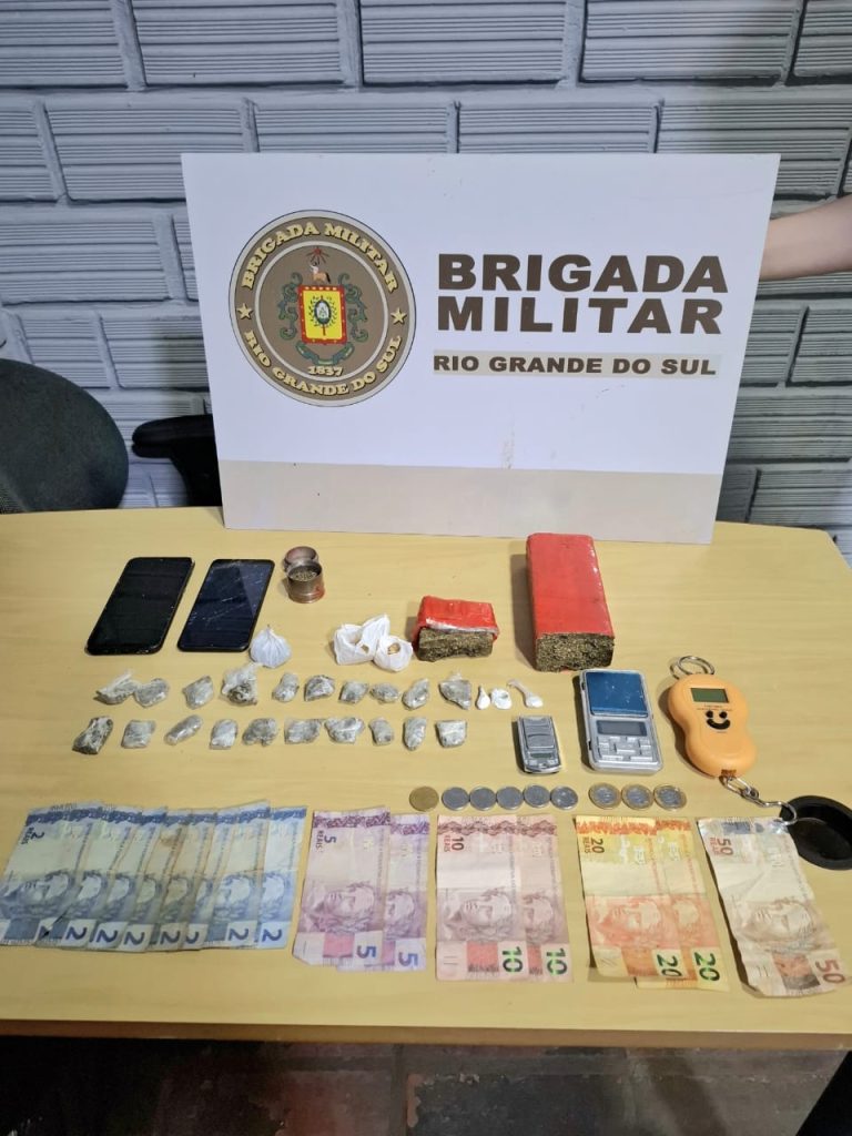 Em revista pessoal foram encontradas 23 porções de maconha, totalizando mais de meio quilo da substância, além de porções de crack e cocaína. O homem foi preso em flagrante pela Brigada Militar.