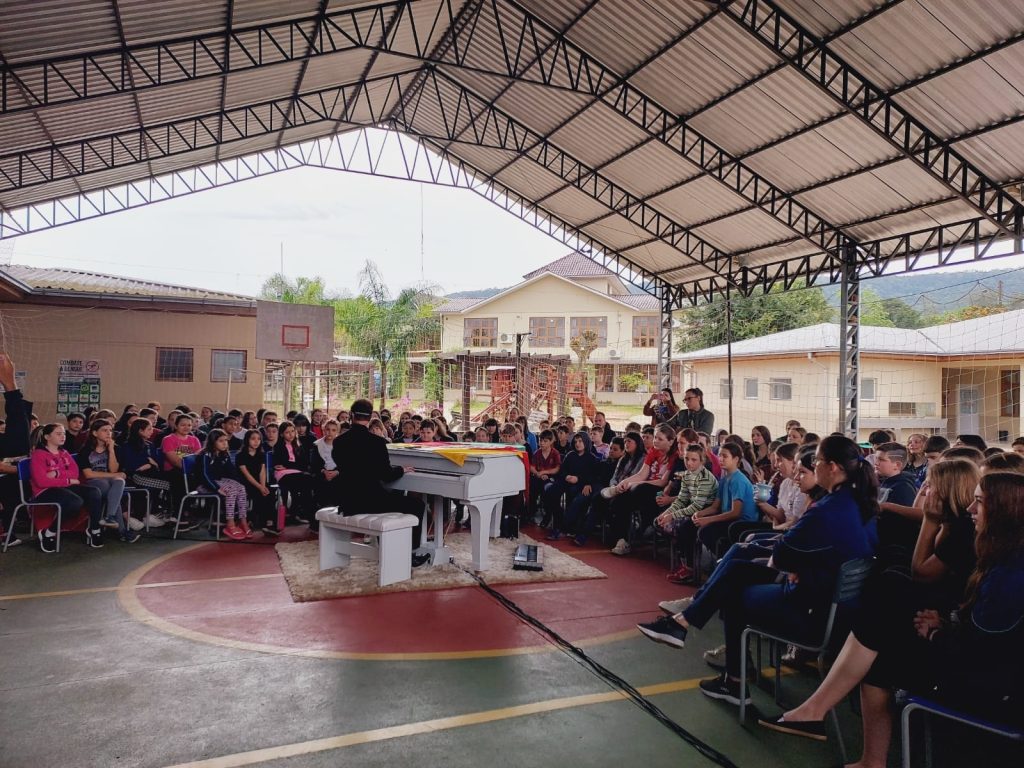 O projeto cultural ‘Tem um Piano na Minha Sala’ iniciou sua agenda de apresentações na semana passada, dia 15, em escolas do Vale do Taquari. A programação contempla recitais de piano e oficinas de musicalização apresentadas pelo maestro William Bayer, levando a experiência musical a alunos do 1º ao 9º Ano.