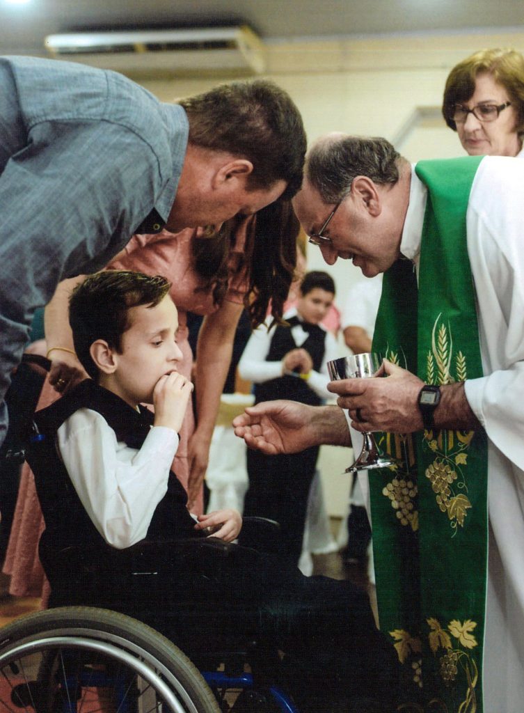 Ela continua assim, naquele dia nos tornamos amigas e desde então nos visitamos assiduamente. Na festa de primeira Comunhão de minhas filhas, lá estava a família Gabriel presente, e o Lê feliz com a música e tantas pessoas. Da mesma forma, participei da Comunhão do Léo, em função da enchente, não houve festa para o Lê, mas seus pais e irmão prepararam algo para a família.