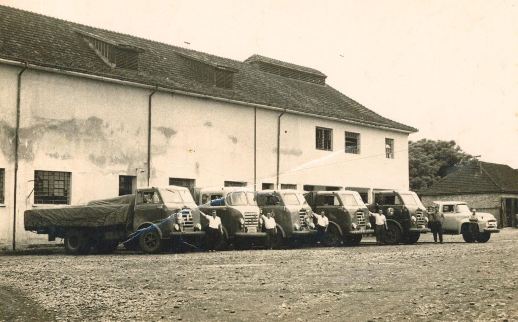 Frota de caminhões dos “Meneghini”, junto ao Frigorífico ARDOMÉ, no bairro Navegantes