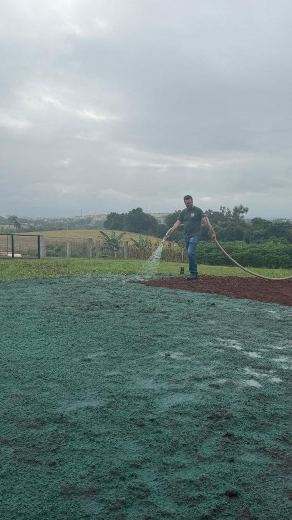 Outro ponto positivo é a personalização. A escolha das sementes varia conforme o objetivo do cliente. Para fins estéticos, são utilizadas gramas de folhas finas, semelhantes à tradicional esmeralda. Já para controle de erosão, é possível aplicar um mix de sementes, incluindo variedades que não exigem manutenção frequente, como corte. Os resultados também aparecem em pouco tempo. Entre 7 e 14 dias já é possível observar o início da germinação, desde que sejam mantidas condições adequadas de irrigação. “A água e o calor são fundamentais. A recomendação é irrigar duas vezes ao dia nos primeiros 15 dias”, destaca.
