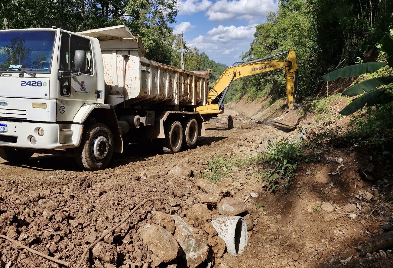 No local, foram executados serviços de patrolamento, alargamento da pista e do sistema de drenagem com bueiros, abertura e limpeza de valetas, roçadas, colocação de saibro e brita, compactação com rolo e outros ajustes necessários ao longo dos trechos atendidos. As intervenções também visam facilitar o escoamento da produção agrícola e melhorar o acesso às propriedades.